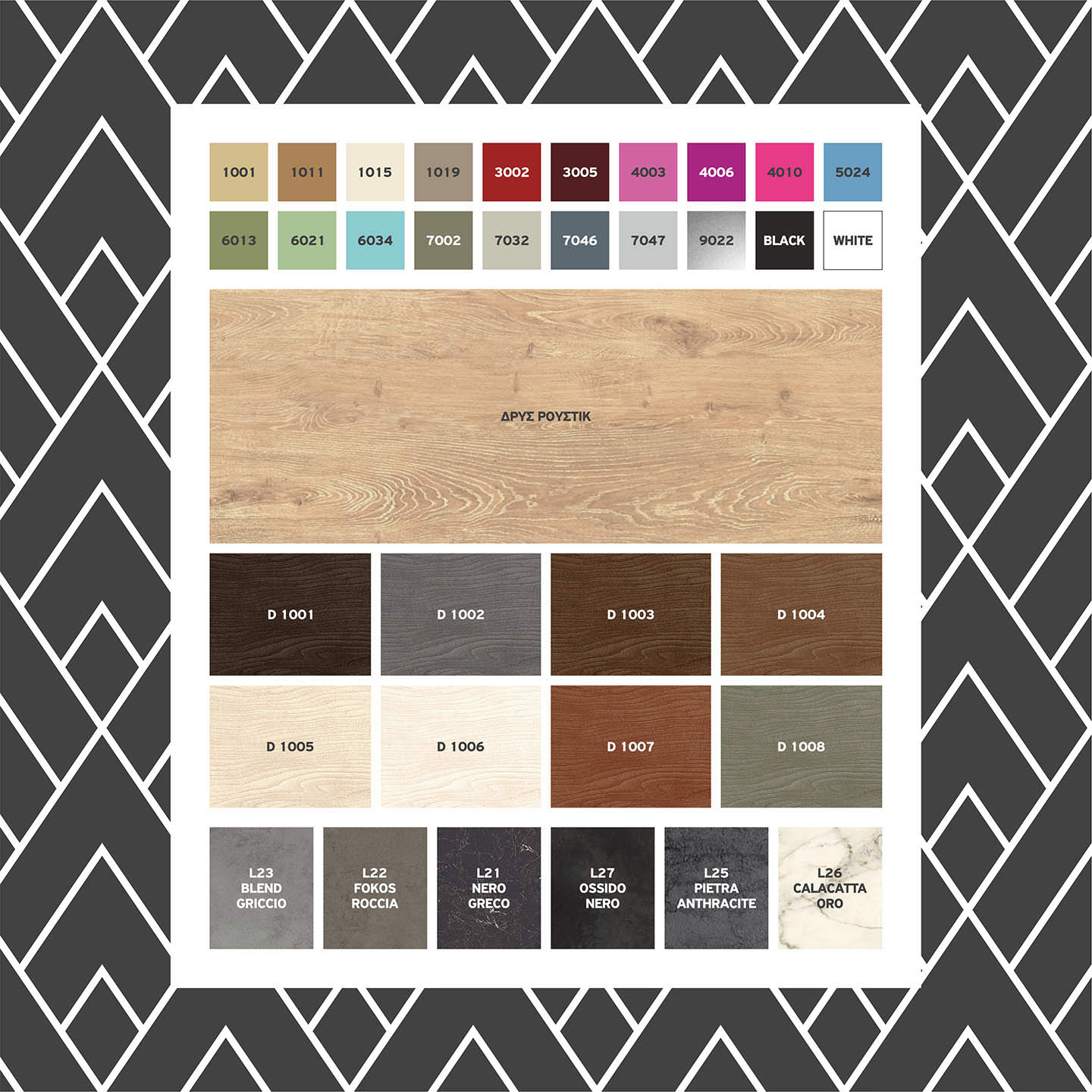 Τα έπιπλα της σειράς CAVALETTO/SPAZIO/FLOOR/ORO/TOP/G-TOP/MINI κατασκευάζονται από Κον/κε Θαλάσσης με επένδυση Φυσικό Ρουστίκ Δρυς και Κον/κε 18mm σε αποχρώσεις Λάκας.